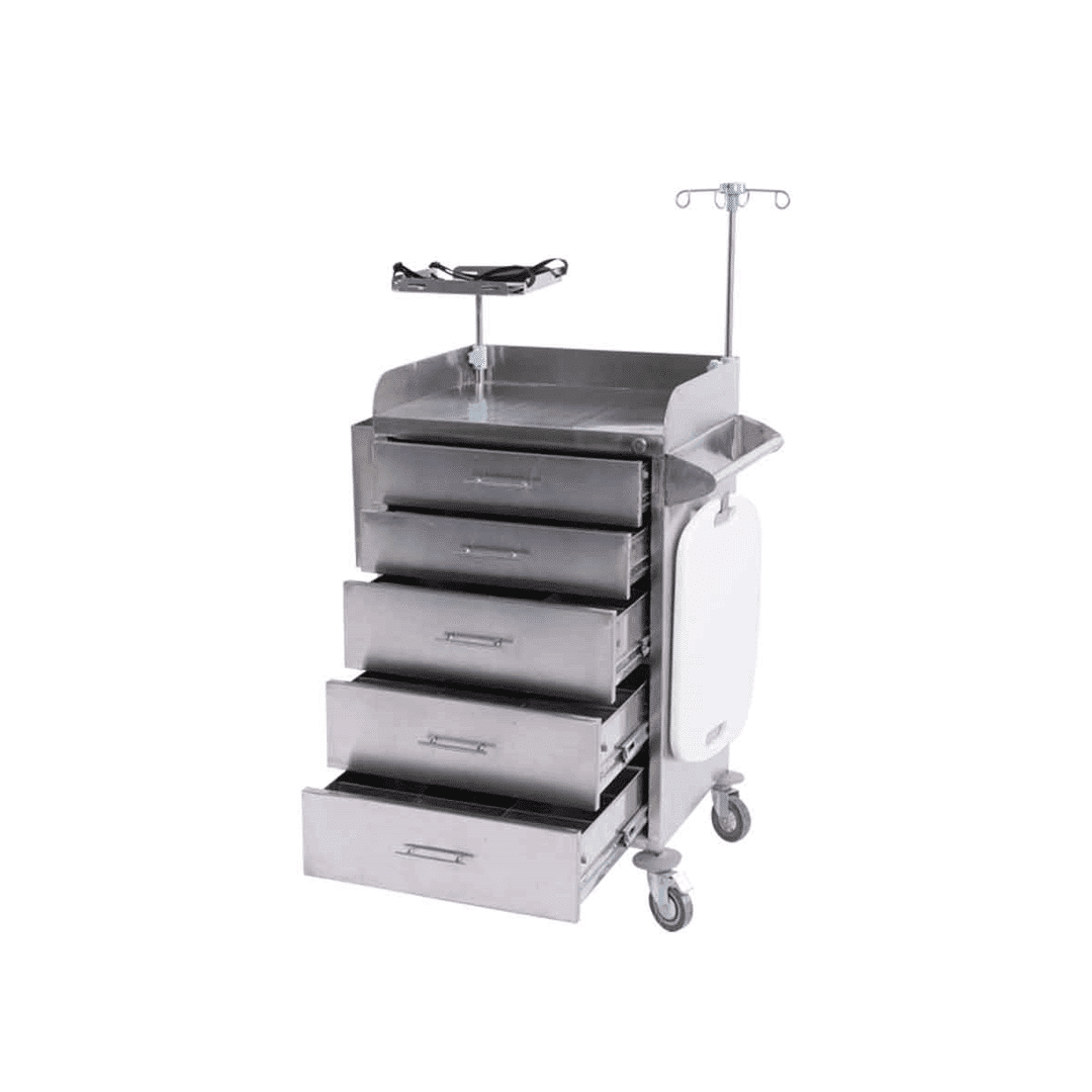 - مزود بـ: حامل اسطوانة الأوكسجين ، حامل محاليل ، ABS ألواح رف لجهاز الصدمات ، صندوق النفايات