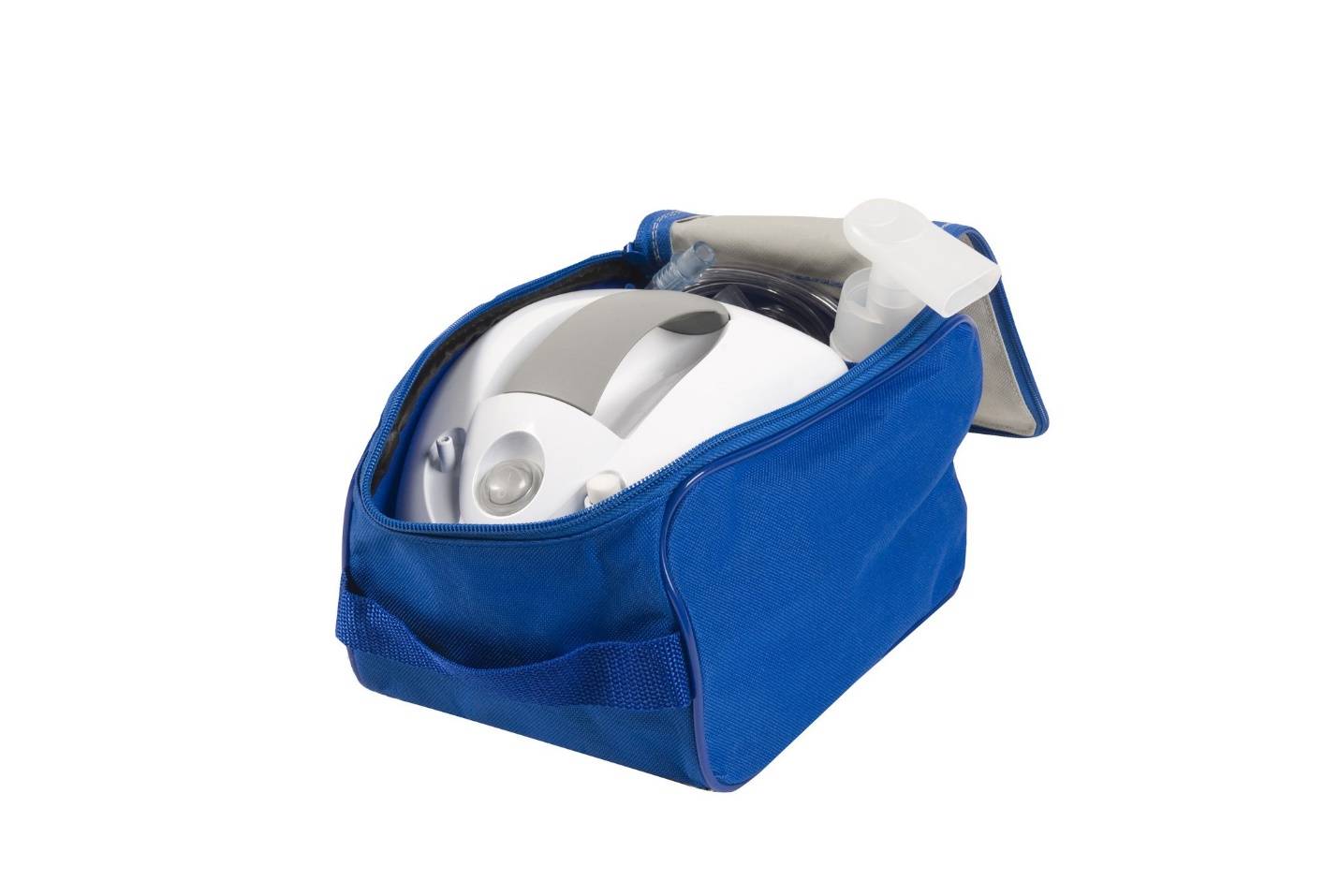A piston compressor nebulizer for aerosol therapy. Designed for home-care with compact size and carrying bag for easy transport of unit, accessories and medications.